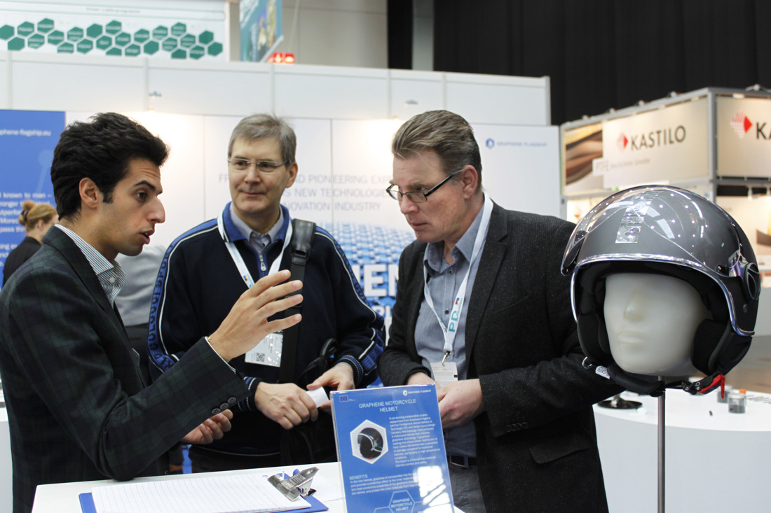 The Graphene Flagship’s exhibition stand showcased products, prototypes and applications along the value chain, from graphene inks and powders, to conductive resins and flexible printed antennas, all the way up to a commercially available helmet with a heat resistant graphene coating, developed through a collaboration between the Flagship partner Italian Institute of Technology (IIT) and design company MomoDesign. “Visitors have been really interested in our helmet, in how graphene was integrated in the paint used as the coating for the helmet, and the possibility to apply this kind of material and technology in paints for cars, for motorbikes and also in the aerospace industry.” said Luca Gagliani from IIT, who was one of the members of the Graphene Flagship on hand to guide visitors to the Flagship’s exhibition stand. Gagliani pointed out that the benefit of graphene lies its multifunctionality, since with graphene it is “possible to get electrical conductivity, thermal conductivity and high reinforcement of the mechanical properties at the same time.”
